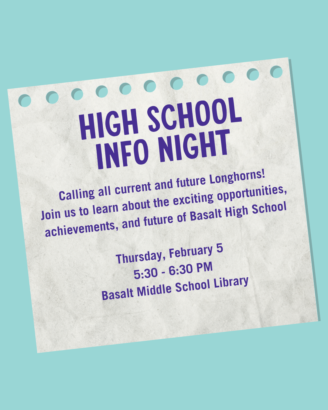 Back to All Events High School Info Night Thursday, February 5, 2026 5:30 PM 6:30 PM Basalt Middle School 51 School Street Basalt, CO, 81621 United States (map) Google Calendar ICS